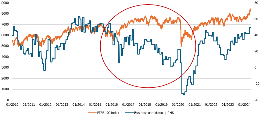 The FTSE 100 went nowhere between 2016 and 2019 as business confidence languished.