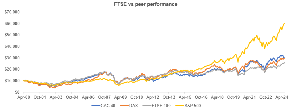 Since 2016, FTSE’s performance gap with peers has substantially widened. Between January 2016 and July 2024, the FTSE appreciated 72% against CAC’s 121%, DAX’s 87% and S&P’s 232%. The uncertainty surrounding the UK's exit from the EU—marked by a complex negotiation process and unclear future trade relationship—severely impacted investor confidence and weighed heavily on the equity market.