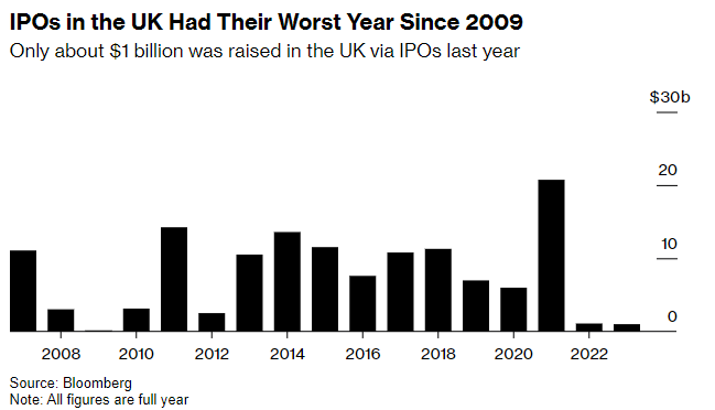 Startup listings in the UK declined 40% since 2008 to their lowest last year. British semiconductor manufacturer ARM decided to list in the US in 2023 to achieve a higher profile and valuation. It was previously listed in both London and New York before its takeover by Softbank in 2016. This hesitation to list was driven by several underperforming startup listings including The Hut Group in 2020, Deliveroo and Dr. Martens Plc in 2021, and Ithaca Energy Plc in 2022.
